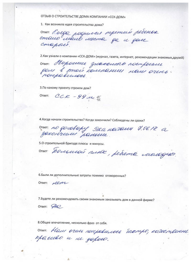 После рождения третьего ребенка стало места мало всем, да и дом, в котором жили, был ветхий. О компании ССК-ДОМ узнали от наших хороших знакомых, которым данная компания построила дом, и нам очень понравилось. Строили по проекту ССК-99М, это Выставочный дом, посмотрели, все понравилось. Договор подписали 5 июня, начали 7 июня, а закончили 7 июля, гораздо раньше срока. О строительной бригаде большой плюс, ребята молодцы. Никаких дополнительных затрат не было, все четко, как в договоре. С удовольствием будем рекомендовать данную компанию друзьям и знакомым. Нам очень понравилось, быстро, качественно, красиво и недорого. Спасибо!